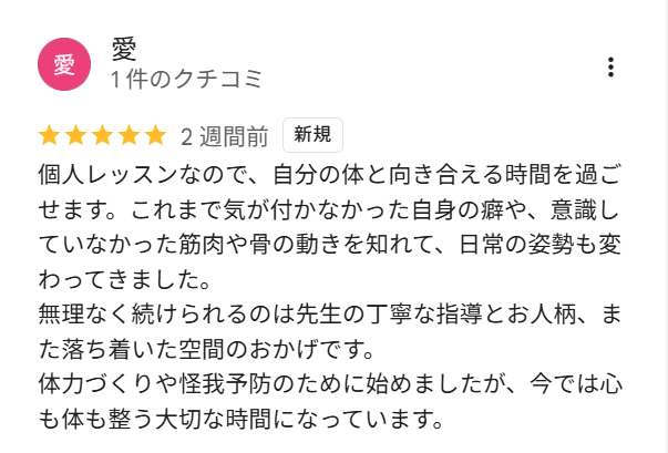 個人レッスンなので、自分の体と向き合える時間を過ごせます。これまで気が付かなかった自身の癖や、意識していなかった筋肉や骨の動きを知れて、日常の姿勢も変わってきました。 無理なく続けられるのは先生の丁寧な指導とお人柄、また落ち着いた空間のおかげです。 体力づくりや怪我予防のために始めましたが、今では心も体も整う大切な時間になっています。