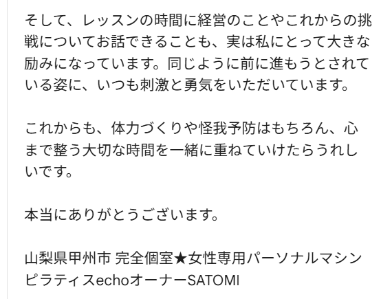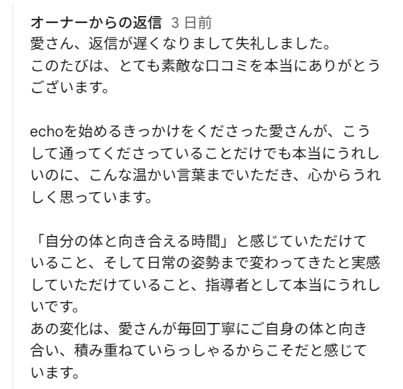 愛さん、返信が遅くなりまして失礼しました。 このたびは、とても素敵な口コミを本当にありがとうございます。 echoを始めるきっかけをくださった愛さんが、こうして通ってくださっていることだけでも本当にうれしいのに、こんな温かい言葉までいただき、心からうれしく思っています。 「自分の体と向き合える時間」と感じていただけていること、そして日常の姿勢まで変わってきたと実感していただけていること、指導者として本当にうれしいです。 あの変化は、愛さんが毎回丁寧にご自身の体と向き合い、積み重ねていらっしゃるからこそだと感じています。 そして、レッスンの時間に経営のことやこれからの挑戦についてお話できることも、実は私にとって大きな励みになっています。同じように前に進もうとされている姿に、いつも刺激と勇気をいただいています。 これからも、体力づくりや怪我予防はもちろん、心まで整う大切な時間を一緒に重ねていけたらうれしいです。 本当にありがとうございます。