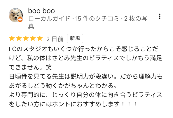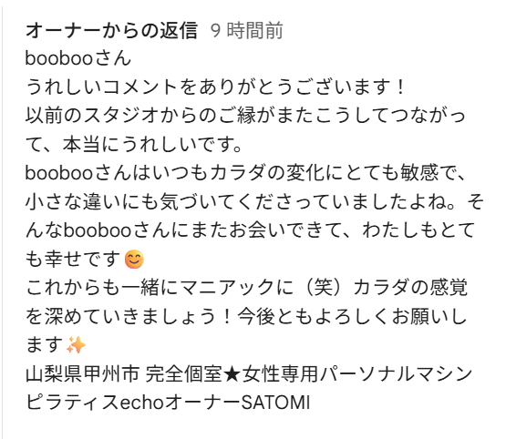 うれしいコメントをありがとうございます! 以前のスタジオからのご縁がまたこうしてつながって、本当にうれしいです。 boobooさんはいつもカラダの変化にとても敏感で、小さな違いにも気づいてくださっていましたよね。そんなboobooさんにまたお会いできて、わたしもとても幸せです😊 これからも一緒にマニアックに(笑)カラダの感覚を深めていきましょう!今後ともよろしくお願いします✨