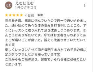 さとみ先生のレッスン後、気になっていた股関節のつまり感がとれ、楽に身体を動かせるようになりました。身体も引き締まり、帰り道とてもスッキリした気分でした(^^)♪ 心地よい変化を感じられ、楽しくレッスンを受けられ充実した時間でした✨またぜひお願いします!